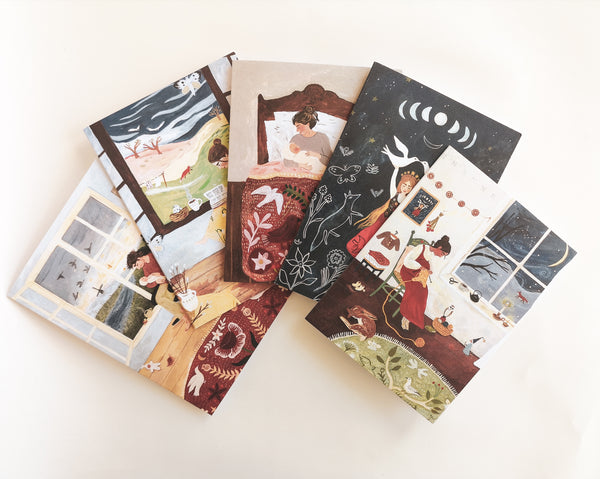 Hochwertige faltbare Karten ursprünglichen Gouachemalerei. Professionell gedruckt in Belgien auf 350 g / m² Recyclingpapier im Format ~ A6.